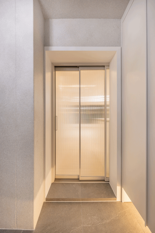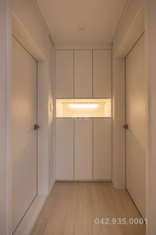 전실에서 바로보이는 장은 무광하이그로시 백색도어이고 하부바닥띄우기를 하여 조명을 시공하였고 입구샷시하부에는 낮은 수납장을 넣어 수납공간을 극대화 하였습니다.